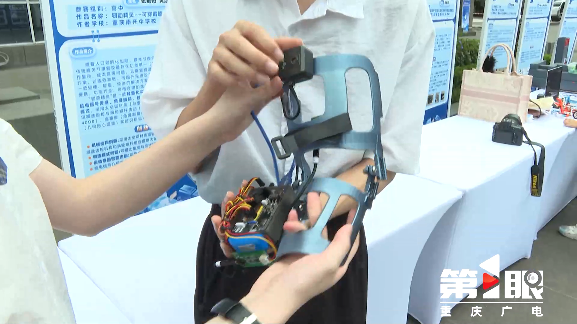 高中组金奖学生张雍柏说,它会采集腿部的肌电信号,当它分析到我们想运动腿的时候,会辅助小腿抬起,来帮助起立或者日常训练康复。另外,在登山走路的时候,可以辅助前行,更加节省体力。