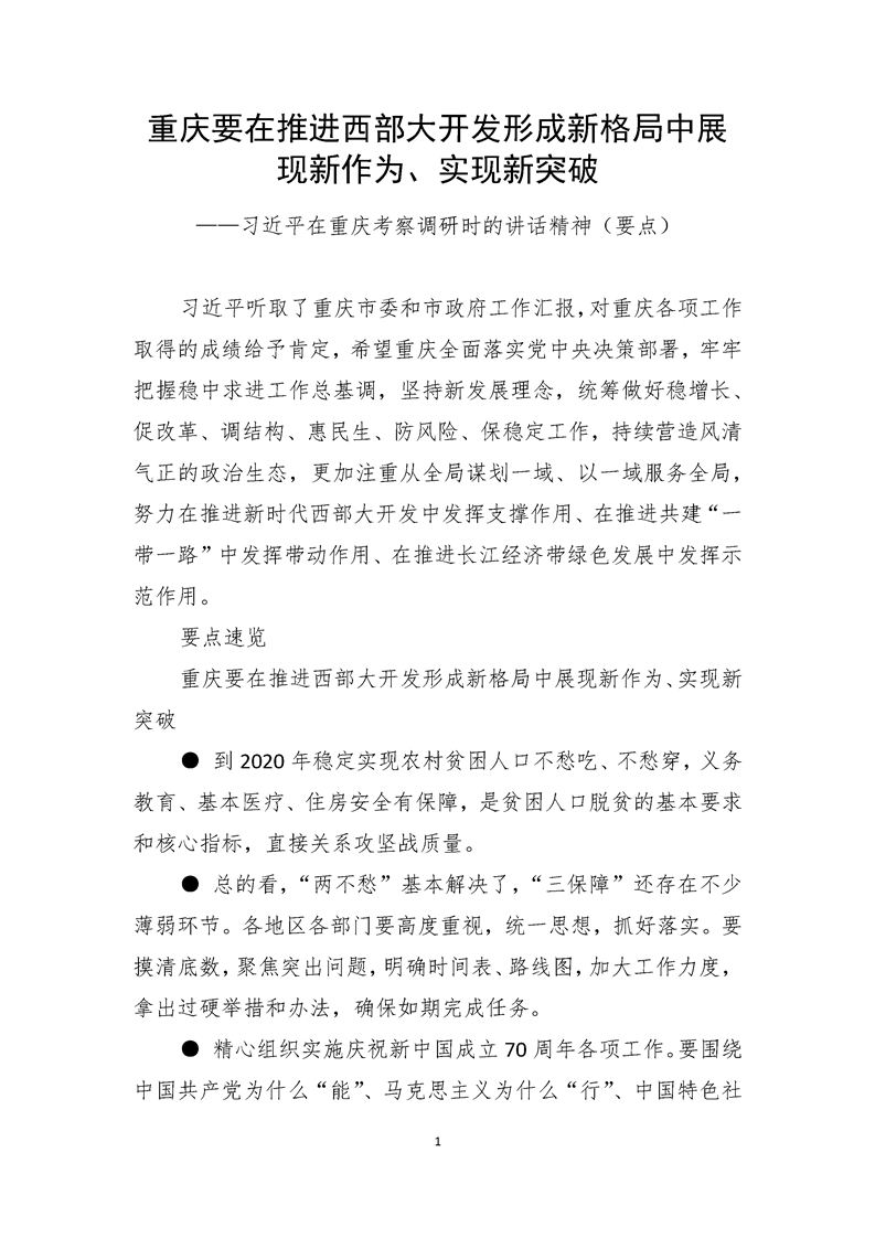 习近平在重庆考察调研时的讲话精神:重庆要在推进西部大开发形成新格局中展现新作为、实现新突破