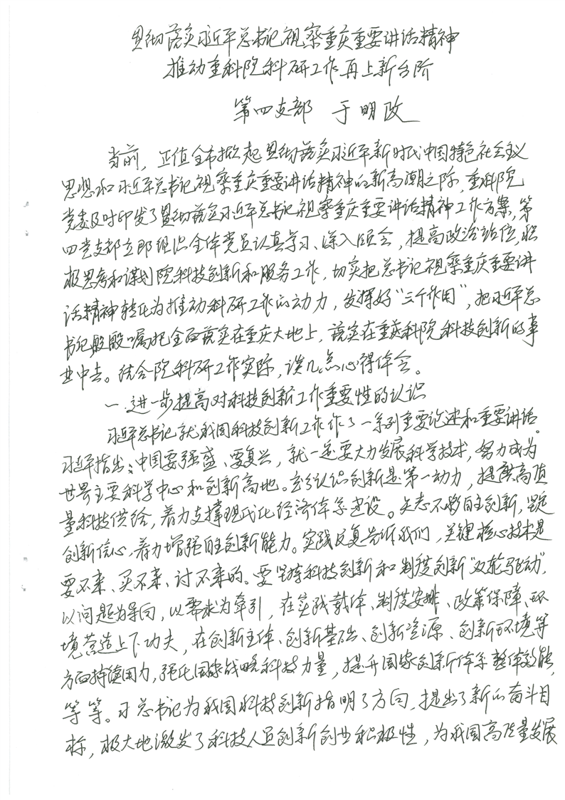 贯彻落实习近平总书记视察重庆重要讲话精神 有助于重科院科研工作再上新台阶 - 于明政