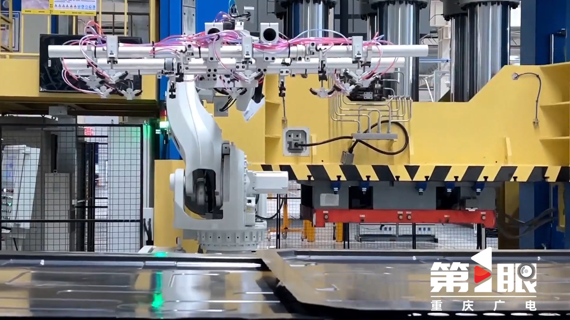 这里是位于涪陵的“卡涞科技”。自动化生产车间里,机器人挥舞着机械臂,一卷卷玻璃纤维布,裁剪后模压成型,变成一件件电池箱的上盖儿,这种高性能的纤维复合材料,在新能源汽车上应用广泛。